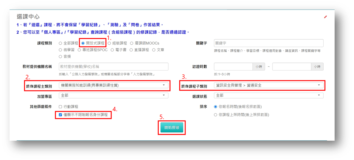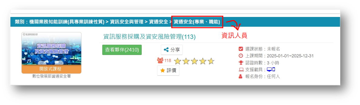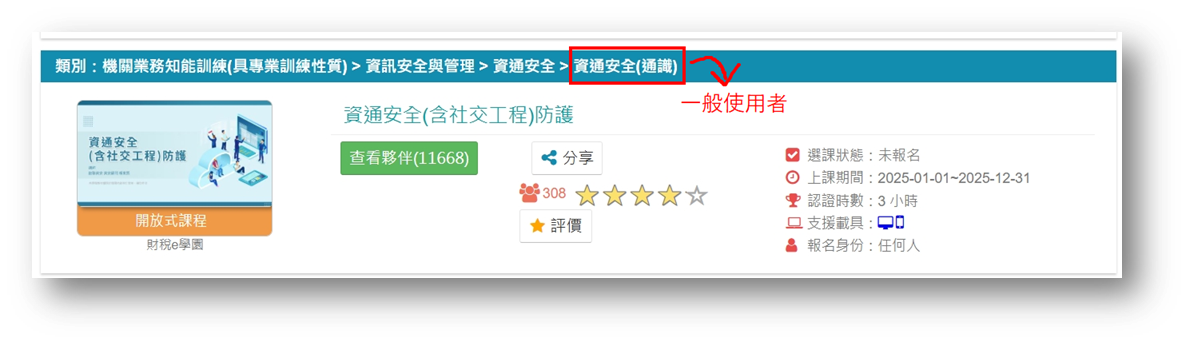 - 終身課程子類別:選擇「資訊安全與管理>資通安全」